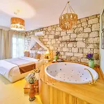 Las habitaciones del Palas Alacati - Adult Only incluyen una plancha y tabla de planchar, climatizador. Algunas cuentan con un patio y una terraza, y están equipadas con un escritorio. Las habitaciones están equipadas con una chimenea de piedra y ventanas insonorizadas, además de suelos de madera noble. Los cuartos de baño incluyen bidé y una ducha, además de comodidades como secador de pelo y zapatillas.